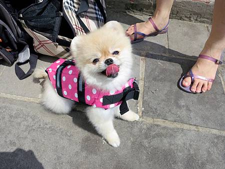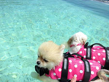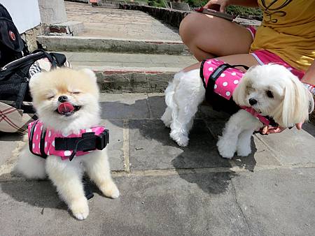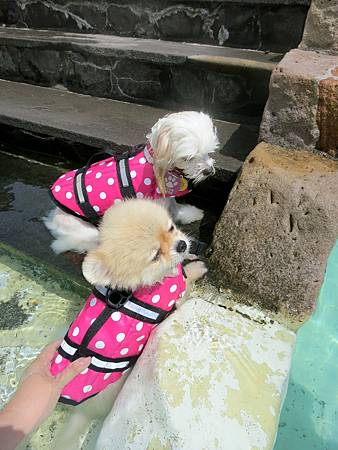 兩隻都穿上一樣的救生衣, 今天是芽比第一次下水喔, 看她一臉疑惑, 游過泳的 Chloe 倒是一臉老神在在~