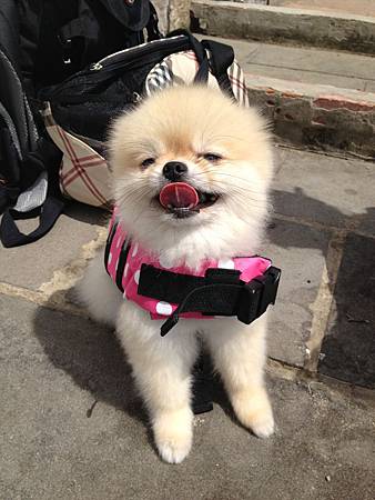 馬上幫 Chloe 穿上跟芽比媽咪一起買的狗狗救生衣, 一臉開心~ ^^