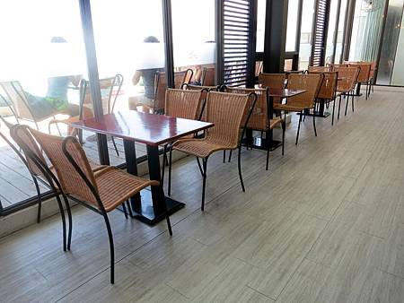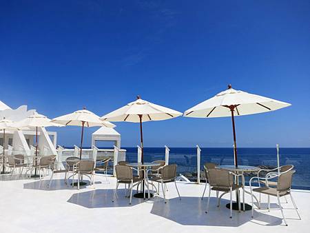 2樓露臺室外海景座位區, 天空好藍! 好美! 坐在這喝咖啡一定很棒, 但今天還是很熱, 所以這裡才會沒人, 還是決定去室內休息~