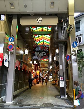 四条通上往鳥丸站方向直走沒多久就會看到圖中的新京極通, 又轉往裡面直走走到第五條小巷右轉就會先看到錦天滿宮, 左邊則是錦市場入口, 請參下方!
