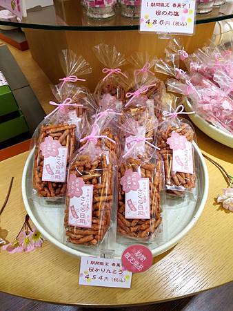桜かりんとう (櫻米果) ¥454 / 1包 (稅入), 這種米果點心在日本很普遍, 但用櫻花葉醃漬的只有櫻花季才有賣!