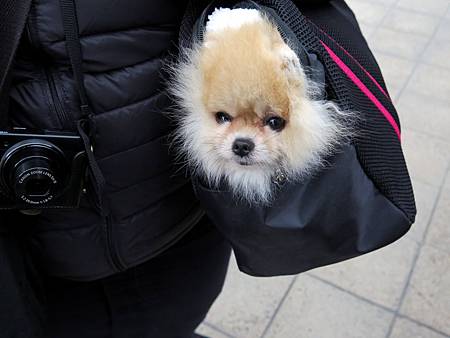 這時雨已經停了, 飄著小雨天氣稍冷, 寶貝躲在包裡露顆小頭看外面風景~